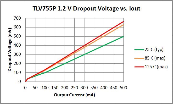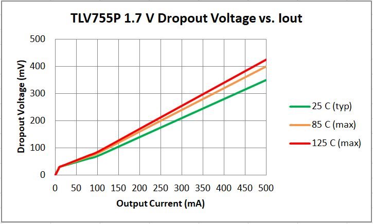 很抱歉耽误你的时间。 可用于类似输出电压的唯一数据是压降电压随温度的漂移、如下所示。 这适用于1.5V 输出电压和500mA 负载电流: