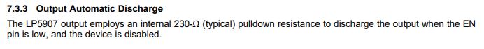 LP5907没有专用的反向电流保护电路。 导通 FET 具有一个体二极管、可为反向电流(OUT 至 IN)提供路径。 该二极管具有寄生特性、因此未表征。 最重要的是、没有电路限制反向(从输出到输入)电流。 通过该二极管对输出电容器放电会产生足够的电流和热量来损坏器件。