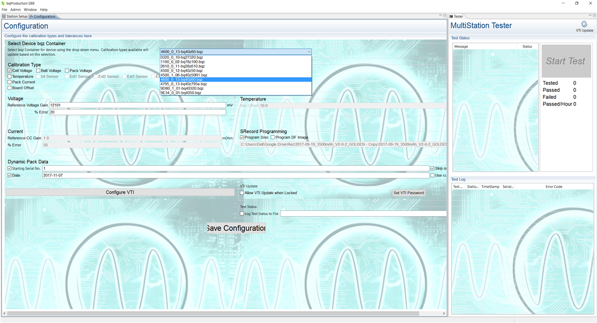 大家好,我正在尝试使用 bqProduction Smart Battery Builder 中的多站测试仪工具。 我将两个 EV2300s 连接到 PC,我可以检测这两个,并可以看到 HPA169校准板上的 LED 闪烁(我已勾画论坛的轮廓,找到几篇文章,说我可以将这些板用于 bq40z60)。 在配置选项卡中,我找不到“4600_0_15-bq40z60.bqz”的选项,尽管这是我在 bq Studio 中使用的选项。 是否有方法将此器件下载到程序中?