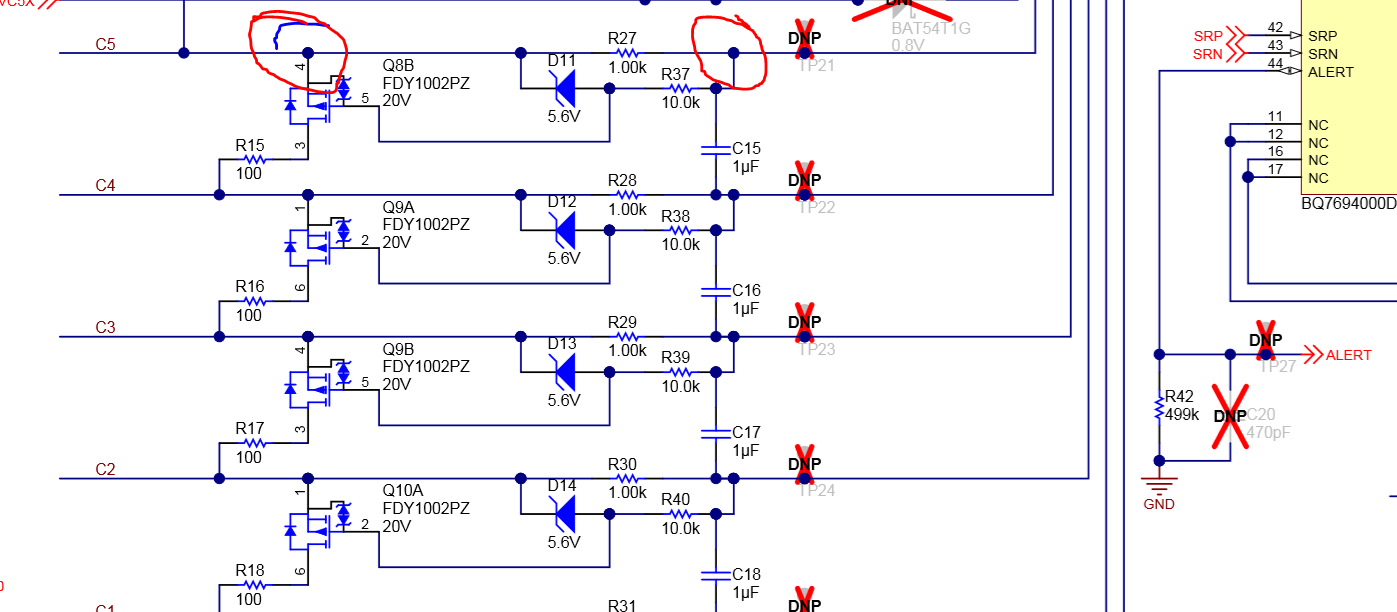 请参阅 www.ti.com/.../slua749 图5和图6。 在平衡 FET 处于该电芯的引脚上期间、电流会一起流入滤波电阻器、从而为 FET 的栅极产生电压、无论是 P 沟道(顶部电阻器)还是 N 沟道(底部电阻器)。 请参阅 www.ti.com/.../slua775 图5、了解平衡期间一起拉在一起的引脚示例以及平衡期间由器件执行的测量占空比。
