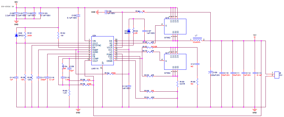 我们在 同步降压控制器中使用了 LM5116、该解决方案与 TI 评估板 LM5116-12EVAL 类似、参数如下:输入电压为30-60VDC、输出电压为12VDC、