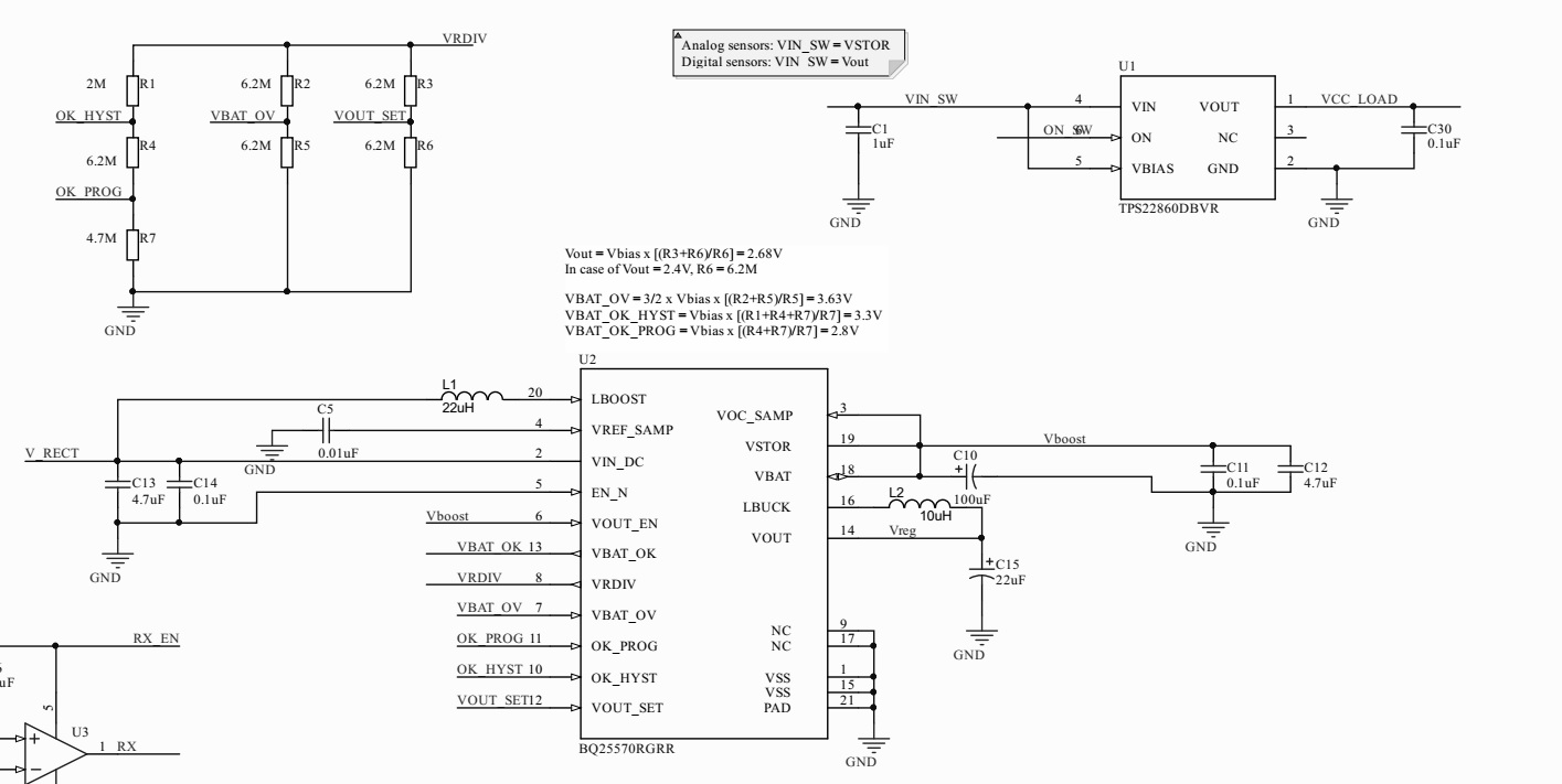 我正在设计一个电路、用于将电压从低功耗源提升到足以运行 MCU 和一些数字传感器的电平。 该电路由一个 BQ25570芯片和一个 TPS22860芯片组成。 请参阅随附的文件。 电路目标是高效控制 MCU 和传感器的电源: