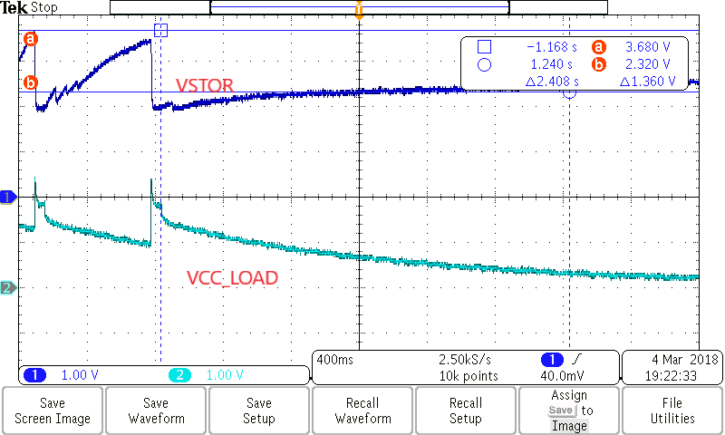 当 VCC_LOAD 连接到 LED 进行测试时(VCC_LOAD 导通后-图1)、电路在前几秒钟就按照上述说明工作(图2)。 之后、VCC_LOAD 再也不会开启。 VSTOR 保持一定的电平(2.1V)、从不下降至0或充电至3.6V。 但是、如果我手动对 VSTOR 电容器(C10)放电、使 VSTOR = 0、则电路再次开始正确运行!