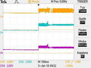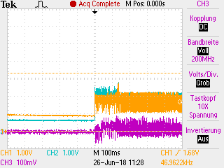通道3 (CH3)紫色:TPS63001的 Iout:在一个10Ω Ω 电阻器上测得(不理想、但它确实起了作用->它对问题没有影响、即使电阻器丢失也会出现问题)。