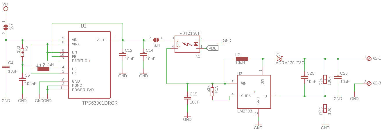 我再次介绍了所有材料,并意识到我在第一篇文章中犯了一个错误。 输入电压仅介于4.5V 和2.8V 之间、因此当我延迟 LM2733的启动时、它可以正常工作(大多数情况下)。 仅在大多数情况下,由于经过更多测试,TPS63001有时仍消耗大量电流,如果 TPS63001的输入电压低于3.2V (负载断开连接),则输出电压不会达到3.3V。 我没有找到恰好发生这种情况的模式。