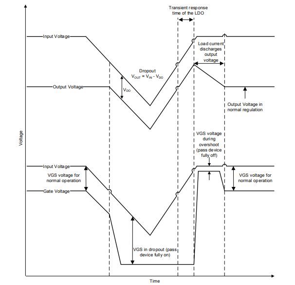 过冲的原因是 LDO 在瞬态期间处于压降状态。   当 LDO 处于压降状态时、输出电压低于精度规格。 这种情况会导致误差放大器强制导通晶体管的栅极、从而使导通晶体管完全导通并提供尽可能小的电阻、这意味着 Vout 尽可能地跟踪 Vin。 当输入电压恢复时、误差放大器必须强制通流器件的栅极进入相反的电源轨、从而使通流晶体管具有更大的阻性。 栅极电压的变化需要有限的时间、具体取决于误差放大器的带宽。 如果 Vin 在此期间快速上升、则 Vout 跟踪 Vin 并过冲至标称输出电压以上。