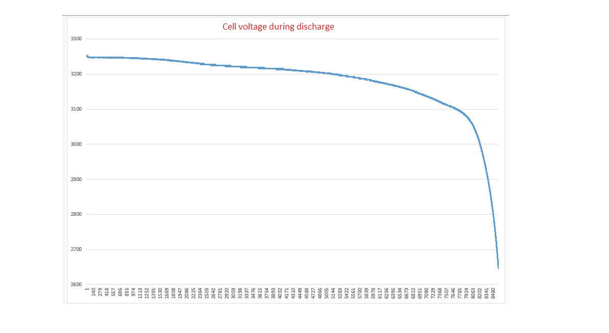 这是因为锂离子电池的平坦曲线行为吗? 随附的是使用150A 放电电流捕获的电池数据。
