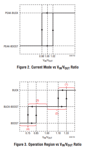 (2)和(3)是的、从纯升压模式或纯降压模式两端、进入和退出降压-升压模式之间存在迟滞。
