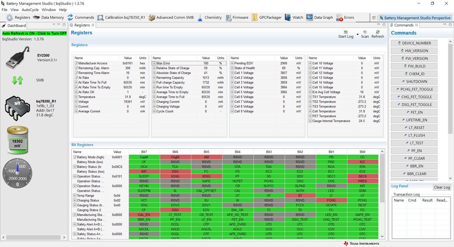 我使用 EV2300和 SMBus 将电池充电至100% RSOC 并监控 Battery Management Studio 数据、然后使用 I2C 和 bq769X0评估软件监控 电池状态。