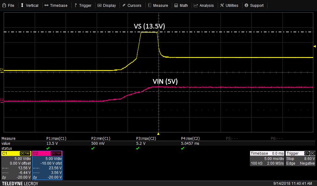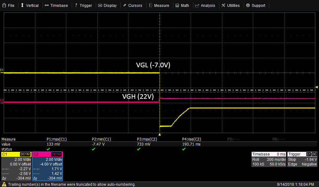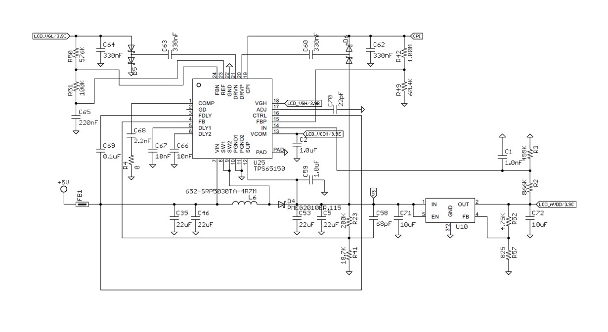 此时已删除 LCD 屏幕、并连接了3个输出电压以及5V 线路。 Vs 会上升到正确的13.5V 值、然后再下降到 VIN。 VGL 也会降至其正确的值、而不是-VIN、但 VGH 不会远高于1V 左右。 如上所述、最初整个电路工作良好。