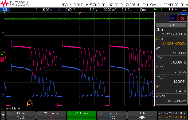 器件型号:UCC28911 在波形上方、CH3是 VS 信号、形状与数据表图22略有不同。 与电压间的关系。 我假设从 Y2 (3)光标点 I 测得的4.2V 是采样的理想点、但波形 峰值 VS 电压大于4.6V (. 请帮助检查高于 VS 波形是否正常,如果>4.6V 可能会触发 OV 故障。 谢谢。