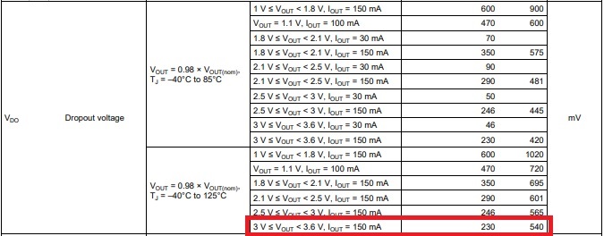 VDO (max)@1mA = Vdo (max)@150mA/150mA * 1mA = 540mV/150mA * 1mA = 3.6mV
