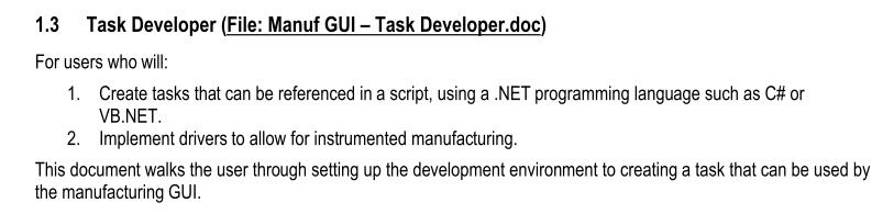 好的、在制造工具用户指南中、请参阅 attachmente2e.ti.com/.../Manuf-GUI-_2D00_-Where-to-Start.pdf、我发现有一个"任务开发人员文档"描述了如何创建可用于脚本的任务。 有人有文件吗?