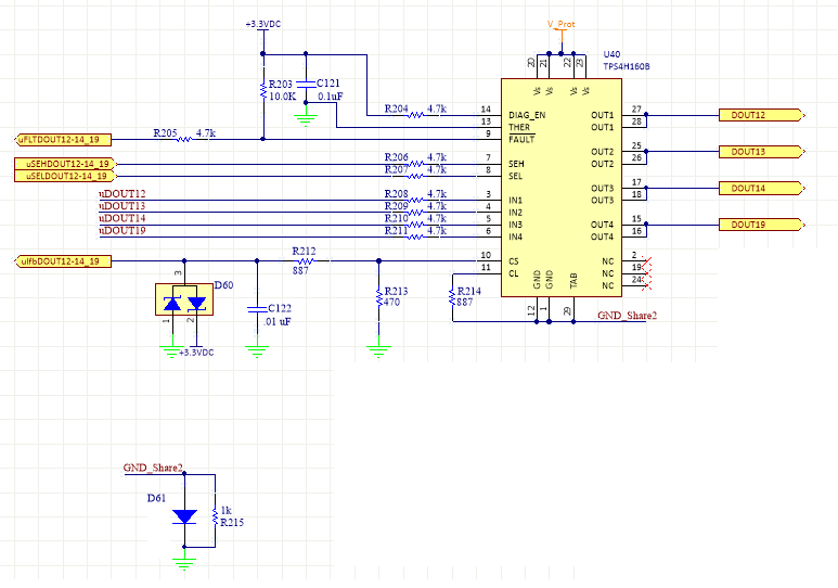我 在一个项目上使用两个 TPS4H160B IC。  它们使用 GND 网络进行配置、如数据表中的图32/35 (电源损耗保护、方法1/反向电流外部保护、方法2)所示。  两个 TPS4H160B 器件共用同一个电阻器和二极管。 在器件暴露于-40至-20°C 的温度范围内之前、所有器件均按预期工作。 在这些较低的温度下浸泡时、电路板通电时、输出不会通过 INx 引脚开启。  我们使用的二极管是 ON Semiconductor S1G (1A、400V)。  我怀疑在低温范围内 S1G 二极管的正向电压增加过多、导致 TPS4H160B 由于 GND 丢失检测而关闭。  由于这是在温度室中、因此我无法轻松测量差分电压。  在"接地失效"保护功能保持输出关闭之前、是否可以分享接地失效检测的工作原理和/或 GND 网络/模块 GND 和电路板 GND 之间允许的最大差分电压是多少?