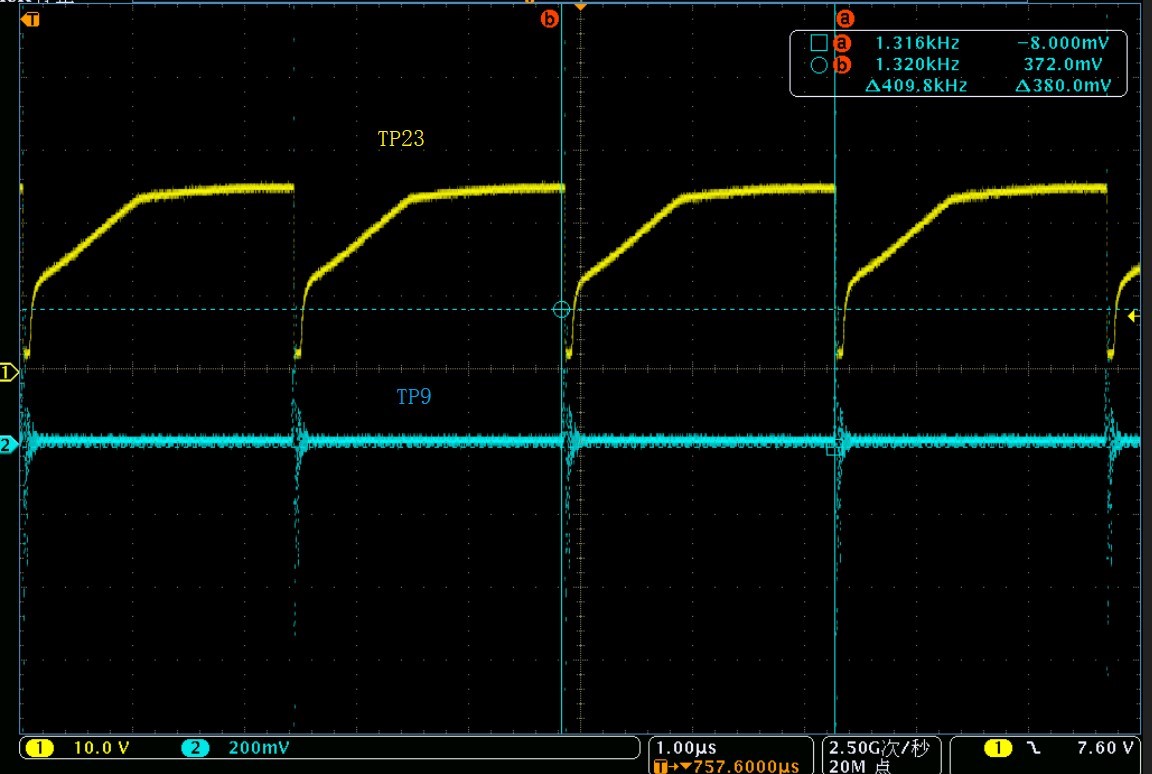 您能否监控 TP9和 TP23电压并将其显示在同一图片上? 请正确设置时间刻度、以便我们可以看到3到5个周期。