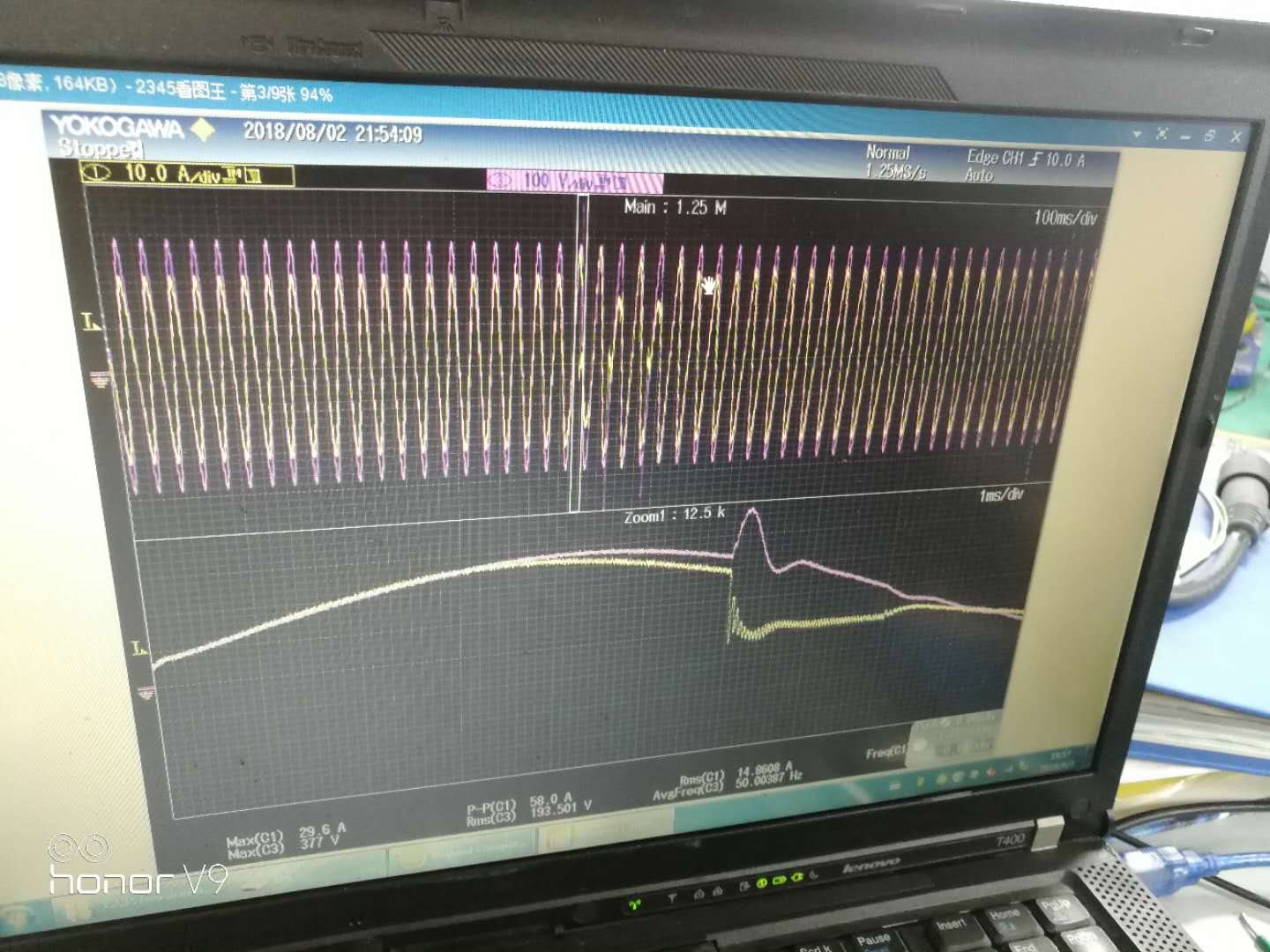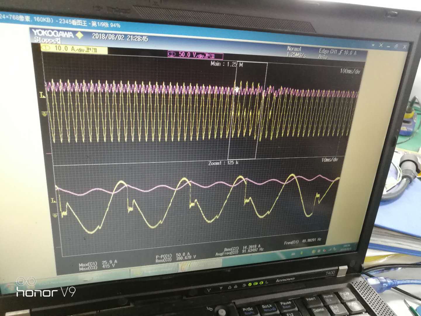 当它们将输入从230VAC 缓慢降低到225Vac 时、会观察到交流电流略有下降、该下降持续几个周期、然后恢复、如下面的屏幕截图所示。