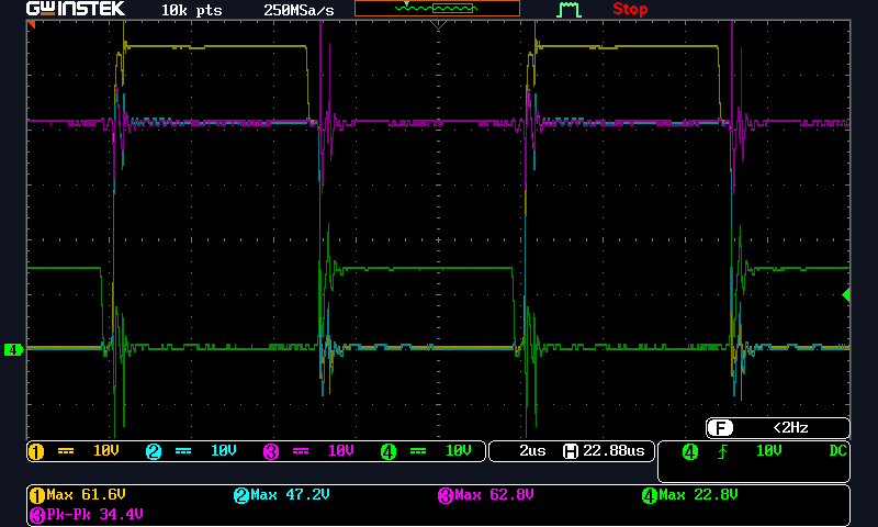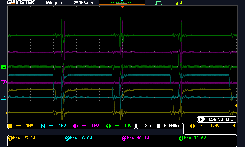 我已经检查过、它在10V 开始时的开关清洁、但当我增大 Vin (如40)时、信号变得非常糟糕、并且 MOSFET 的15V 电源波动非常类似于0-5A 和2-40V。 这些值采用台式电源。