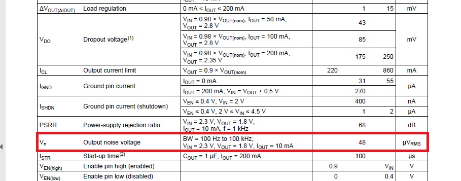 一份展示我们如何测量噪声的应用报告。 这是 VOUT 为1.8V 时的典型噪声。  随着 VOUT 增大、噪声将增大。 遗憾的是、我没有最大噪声、因为我们没有将该 LDO 定位为低噪声器件。