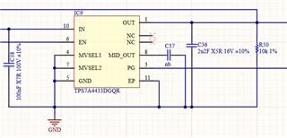 我在引脚10上得到了100nF。 引脚1上为2、2uF。 MID_OUT 未使用、并获得10uF 至 GND。 MVSEL1和 MVSEL2直接绑定到 GND。