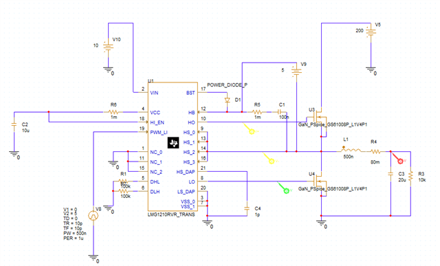 它配置为1MHz 开环降压转换器。 PSpice for TI 不包含任何 GaNFET (除了具有集成驱动器的 TI FET 外)、因此您需要从其他供应商导入模型。 我的仿真同时适用于 GaN 系统和 EPC GaNFET、因此我知道这些仿真至少应该起作用。
