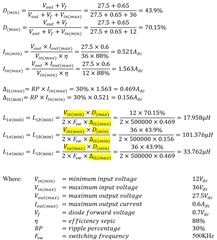 我目前正在使用 LM51561设计 SEPIC 转换器、但在线发现关于如何计算所需耦合电感器电感的信息存在冲突。 我附上了到目前为止完成的计算、但关于标记为黄色的器件、我不确定应该使用哪一个来获得正确的电感值。 最小和最大输入电压适用于两个不同的电源、一个为12Vdc、另一个为36Vdc。 不会在中间电压之间使用。 27.5的输出电压最终将为两个串联的12V 电池充电。