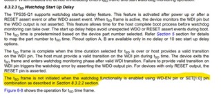 我对启动延迟功能有疑问。 根据产品说明书、第 19、如前所述、"当使用 WD-EN 引脚或设置[1]:0引脚组合启用看门狗功能时、TSD 帧不会启动、如第8.3.2.2节所述"(根据随附的图像)。 我无法理解这一点。