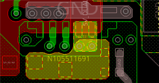 2、在 PG 过孔移动后、将0.1uf 和2uf 电容放置在尽可能靠近 VIN 和 PGND 引脚的位置、使 GND 平面从输入电容 GND 连接至 PGND 引脚。 并添加更多过孔。