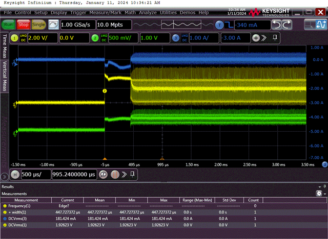 3.我们需要 USB 运行模式,只连接到 U 盘, 我们能否关闭电荷泵,保持 USB 功能正常,因为我们发现当电荷泵打开时会出现500mA 尖峰,请看测试波形,蓝色是电流,正极是 VBUS 引脚,黄色是 VBUS 电压;