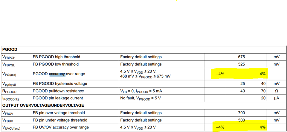 Vuvov 和 VPG 的测量准确度为+/-4%。 例如、FB 引脚上的 VPG = 500mV、测量 VPG 的内部电路具有+/-4%的精度。 报告的值介于0.96*500mV=480mV 和1.04*500mV=520mV 之间。