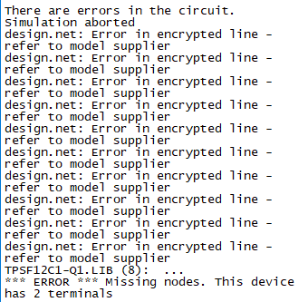 1、客户尝试使用 PSPICE 模型导入到 Simetrix 中、但无法正确仿真、报告了以下错误。 请帮助验证 TPSF12C3的 PSpice 模型是否与 SIMETRIX 兼容?
