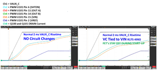 Vaux_C 启动时间的变化会影响此持续时间、更快的启动会导致脉冲更长。 查看数据表后、建议将 VC 和 VIN 连接在一起、如下所示: