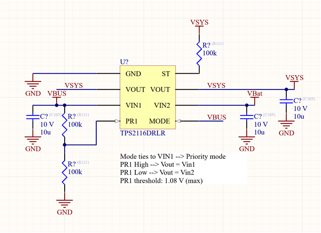 我想使用 TPS2116在 USB VBUS 与锂电池之间切换。 我计划使用 USB VBUS (5V)作为主电源、并在移除 USB 后切换到电池(最大4.2V)。 我想知道