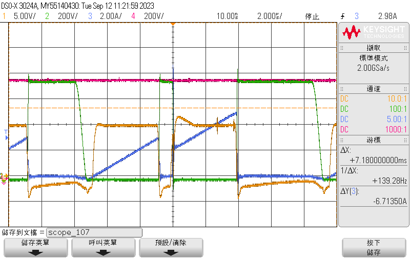 蓝色:Id_Mosfet、黄色:Vgs_Mosfet、绿色:Vds_Mosfet、红色:大容量电压