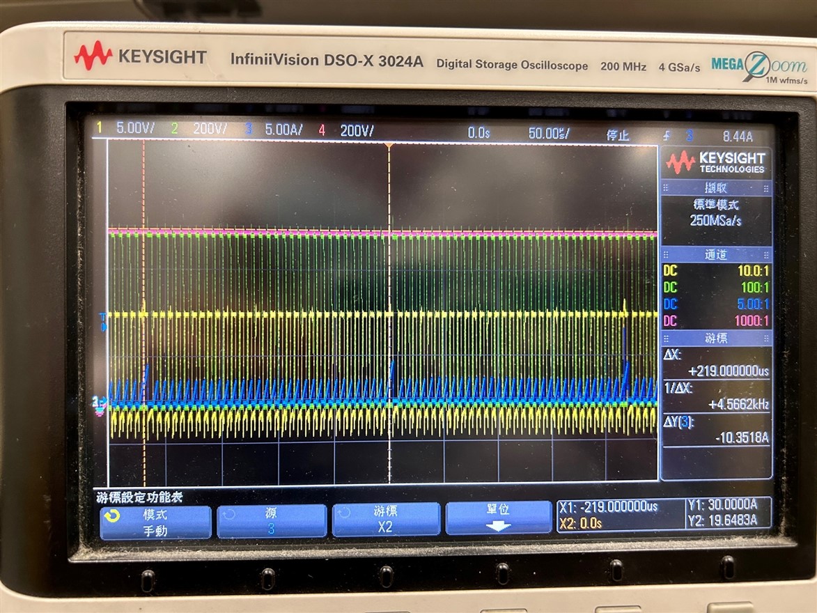 我们为该设计使用320V 直流输入。 我们发现开关电流变为 CCM、而不是 CrM、并定期出现在~ 4.5kHz 上。 请参阅下面的波形。