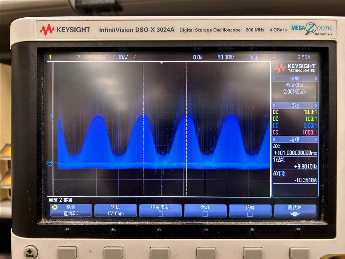 当2MSA/s =每次扫描1MSamples 时、此数值为0.5s。 即每1us 一次采样、因此我认为采样会沿每个开关周期的电流斜坡上升和下降、电流斜率只有几微秒宽。 这似乎是一个可变电流、但放大到"正弦波"上的任何点应显示恒定的平坦振幅(除了每220us 发生一次重启时会出现一个双峰值)。 请通过缩放来验证这一想法、并在以50ms/div 的扫描速度时尝试增加采样率。
