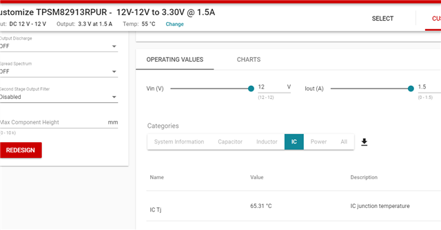 VIN = 12V。 VOUT=2.6V-3.3V。 电流规格为1.5A。 根据数据表、预期结温为~85C-90C。