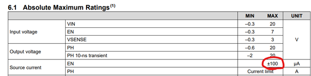 标记的电流意味着 EN 引脚在运行期间提供的最大电流为100uA。 如果 VEN 小于其下降阈值且 Vin 低于其 UVLO、IC 将停止工作。