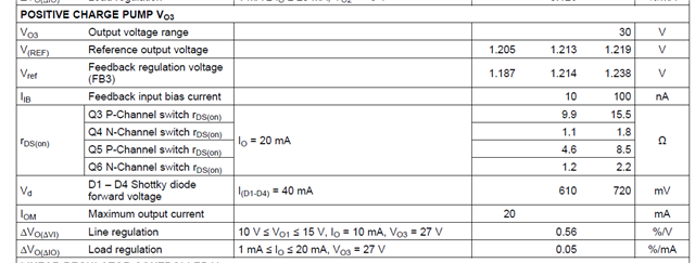 电荷泵能够提供最小负载电流20 mA。 根据 VO1和 VO3之间的电压差、可以使用更高的负载电流。