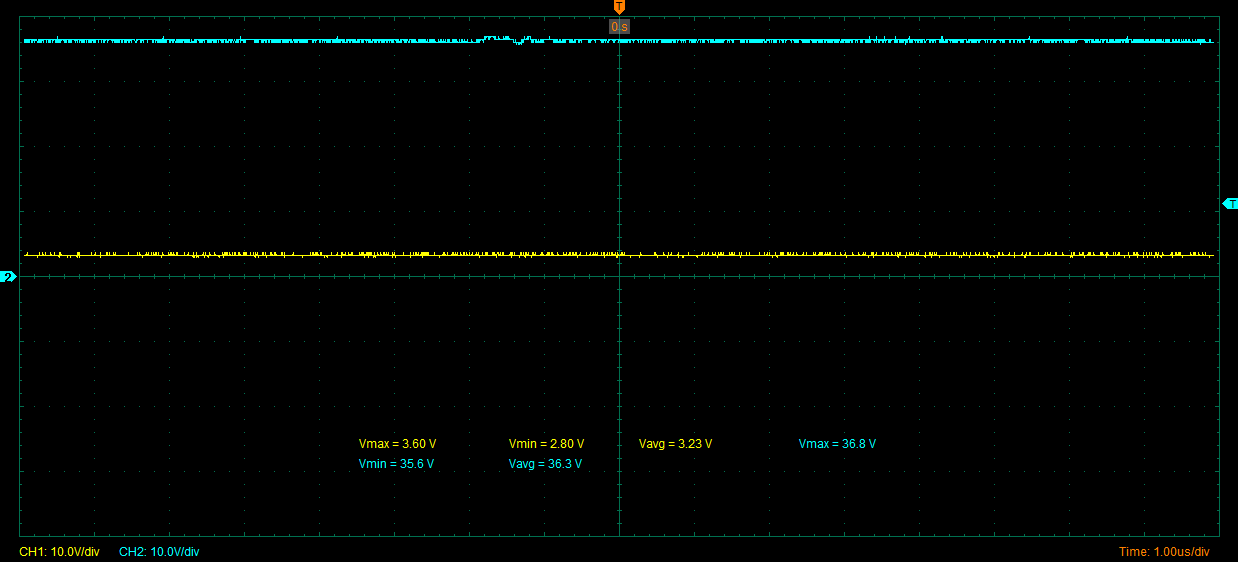 空闲~下、我将在36V 直流输入电压下消耗 Δ V 40mA、这意味着我将其降至16V、然后降至3、3V。 没有热量、一切都是完美的、这意味着对降压电压的分析具有极低的纹波和无噪声、并且 MCU 的控制操作也非常好和锐利。