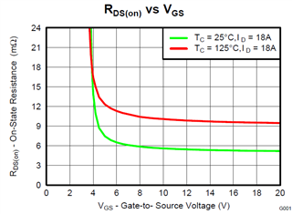 如果我们的低侧 MOSFET 为 CSD18563Q5A、则 RDSON 与温度的关系如下图所示。 鉴于 LM5145栅极驱动器在7.5V 驱动 VGS、这意味着 RDSON 在25°C 时为6m Ω、在125°C 时为10.5m Ω。