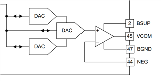 我认为这是一个可以支持所有偏置的芯片、我并没有在这块芯片上使用 WLED 驱动器。 读 VCOM 应用时的代码。 我看到应用示例连接了一个 VCOM-FB (feedback?) 连接到 NEG 端子(VCOM 缓冲器的反相输入)。 我想知道它是如何工作的、因为我的 LCD 没有 VCOM 反馈引脚、这是否意味着我无法在此芯片上使用可编程的 VCOM 缓冲器? 或者、它是否意味着我实际上必须参考一些其他电压。