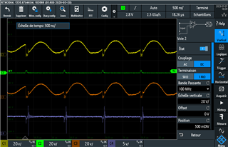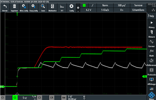 下面是一些测量值:(红色:工作板、绿色:空载时有缺陷的板、白色:带有750mA 负载的有缺陷的板)