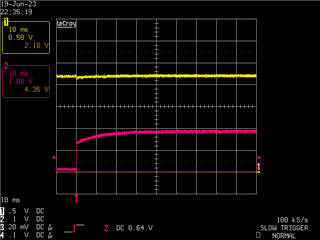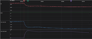 在我看来、随着对 LDO 何时导通和关断的时序进行更多测量、这可能是一个综合问题:首先、浪涌会降低 VIN (~20us)、但并不会一直降低到 LDO 关断时的电平。 然后 VIN 下降速度较慢、会在另~200us 后关闭 LDO。 我假设该电压下降可能与放在千欧姆电阻器后面的网络上其他电容的充电有关。