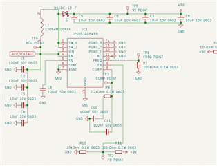 器件型号:TPS55340 大家好、我创建了一个升压逆变器项目、将电池电压(额定电压为3.7V)提高到9V。 遗憾的是、当电源被连接时、电路汲取的电流接近2.5A、并且不输出电压。 如果您可以查看我的原理图并提出可能的错误做法、我将不胜感激。