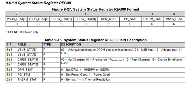 IC 表示它 未在充电 (REG08值十六进制84)-给出的值为10 =适配器端口、00 =未在充电。