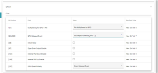 我们使用 TPS25750上的 GPIO 来控制直流/直流转换器的反馈。 这是通过将事件映射到控制 GPIO 输出的 GPIO 来实现的。 一旦发生特定事件、输出将为高电平有效。 这些可以使用 GUI 进行配置、并且在器件加载此映像后、即在器件的配置中。