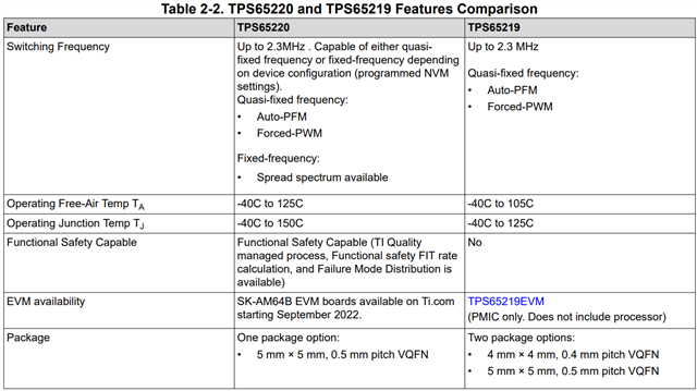两个 PMIC (TPS65219和 TPS65220)均可用于为处理器、AM62或 AM64供电。 客户必须根据自己的应用温度额定要求选择 PMIC。 下表显示了 TPS65219与 TPS65220 PMIC 之间的差异。