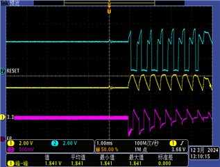 关于2kHz:在反馈信号干扰之后、输出电压升高到预期的 Vin、但随后复位信号变为低电平、这是为什么? 哪个部分激活复位? 我们也会在 REST 信号上看到2kHz!