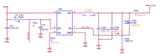 1. 当使用 TLV62568PDRLR 为 WiFi 提供3.3V 电源时、我们发现、当 SOC 强制将 GPIO (W3.3EN)设置为低电平时、使使使能引脚保持2V 的电压、从而使 WiFi 仍可使用3.3V 电压、您有什么想法吗? 红色圆圈。