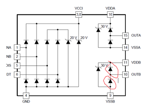 2.输出级由 NMOSFET 组成,而 NMOSFET 则相反地表现为一个二极管。 因此、该二极管的反向耐受电压为30V、即 VDD VSS 绝对最大额定值。 正向额定功率通常为电流、因为该电压应钳制在0.7V 左右。 您可能会根据部件的功率和热系数得出安全的连续功率等级。 准确识别瞬态电流将更具挑战性。 但是、如果 OUT 短接至 VSS、将会有高电源电流。